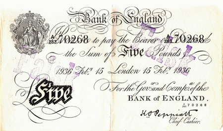 Den ægte falsk seddel beslaglagt af dansk politi. Sedlen skulle sammen med andre have været afleveret i 1946 til Bank of England, men et par sedler ”faldt ud af kassen” inden afsendelse.